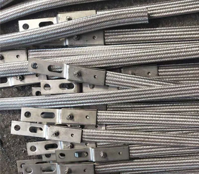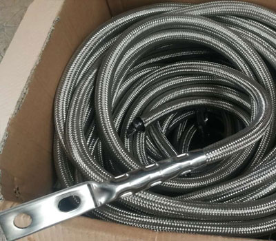 鎧裝式柔性石墨接地引下線內(nèi)部構(gòu)造,帶狀,連接頭連接牢靠,連接頭宜采用螺栓鎖緊式工藝和304不銹鋼材質(zhì)。石墨層內(nèi)部需為厚度為1.25mm的鏤空狀304不銹鋼帶,石墨層外部為不銹鋼絲編織層,不銹鋼絲外部為黑黃相間的熱縮管。規(guī)格型號應(yīng)和配套的石墨基柔性接地體相同。